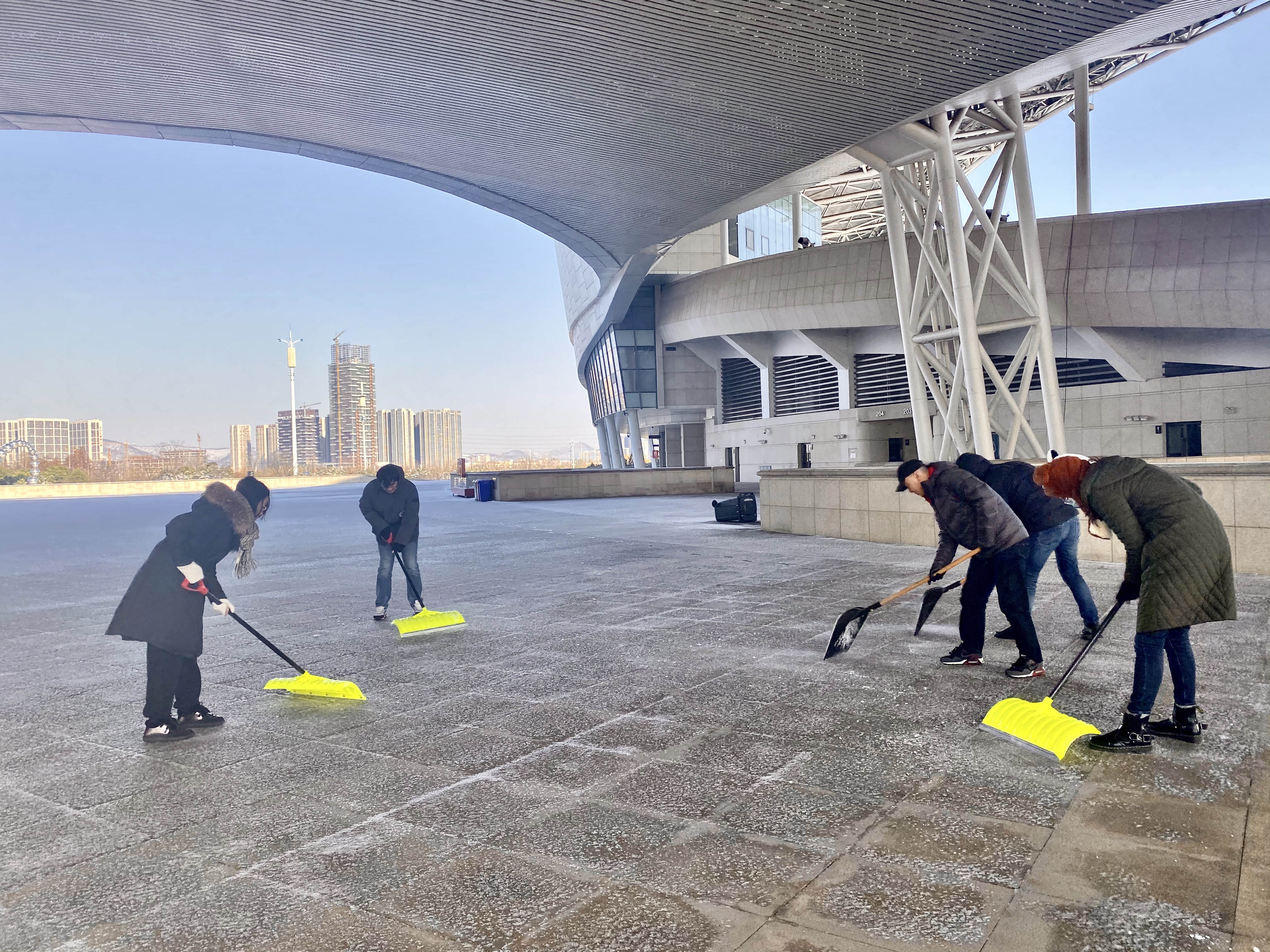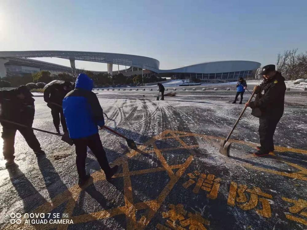 12月30日南京最高温 -2℃到-3℃,经过前一夜雨雪的“光临”,南京青奥体育公园内部道路出现大面积冰冻。为保障所有进入园区内观众和工作人员的安全,防止恶劣天气对场馆造成损失,场馆公司提前安排值班人员,并召集组织全体员工进行扫雪除冰工作。场馆公司所有员工通力协作,除保障园区各出入口、停车场、广场等重点区域外,加大保障场馆台阶、斜坡、屋檐等易结冰伤人区域的安全。