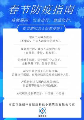 根据南京市疫情防控需求,认真贯彻落实《关于进一步把牢“十个关口”做好冬春季疫情防控工作的通知》(宁防指〔2021〕1号)精神,南京市融创体育健康科技小额贷款有限公司积极配合江北新区研创园及相关部门要求,完成春节期间企业员工离宁返宁情况统计、防疫物资的足量购置、访客台账记录及制作春节疫情防控指南等相关事项。![]()