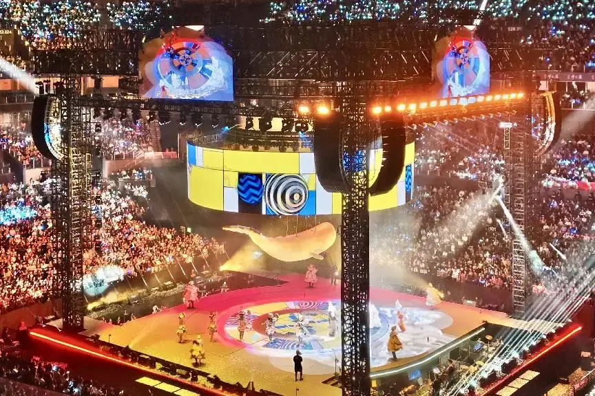 走进梦之蓝青奥体育公园体育馆,3D立体光影、飞天鲸鱼、旋转巨熊等舞美营造出梦幻的“海陆乐园”;全新的解构四面台设计,让场馆内每个座席位置都成为独一无二的观演视角。在这里,看演唱会不止是聆听、观赏,更是全身心的震撼投入。