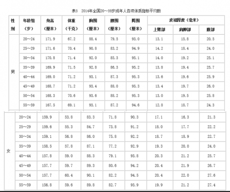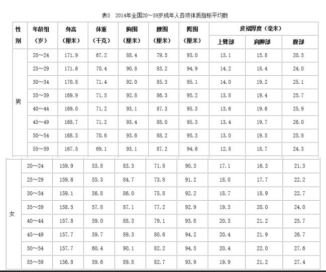 2014年,各年龄组的身高、体重、胸围、皮褶厚度等身体形态指标平均数比2010年均有所增长。自2000年以来,我国国民各年龄组人群的身高、体重、皮褶厚度等指标呈持续增长趋势,但体重、皮褶厚度等指标增长幅度大于身高。