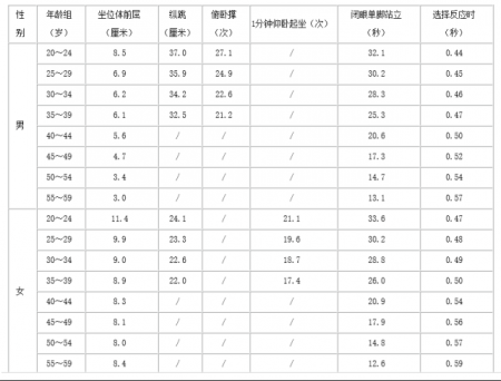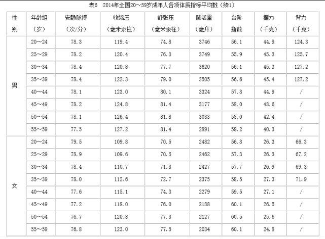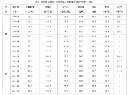 表7 2014年全国20~59岁成年人各项体质指标平均数(续2)
