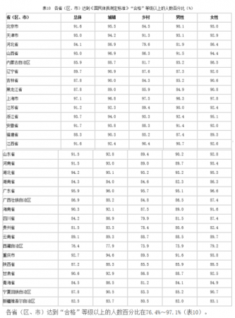 与2010年相比,全国有16个省(区、市)达到“合格”等级以上的人数百分比有所增长、1个省(区、市)持平、14个省(区、市)有所降低。