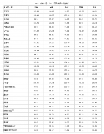 各省(区、市)“国民体质综合指数”的总体水平在93.82~107.91之间(表11)。