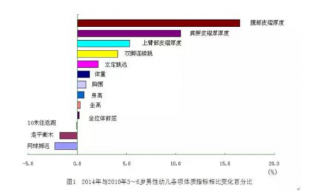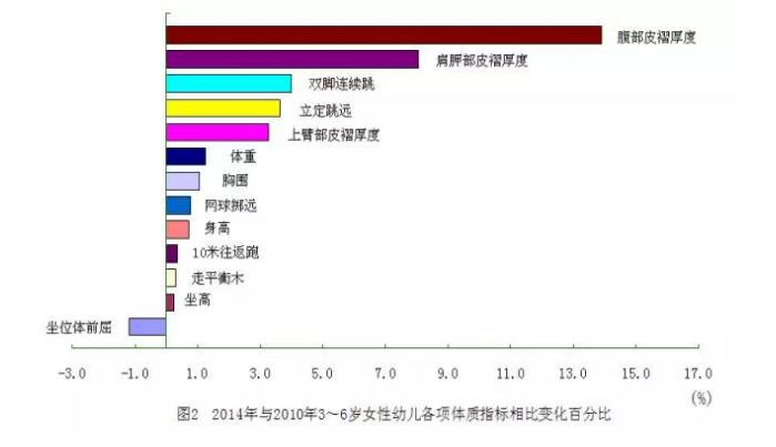 与2010年相比较,2014年3~6岁男性幼儿的皮褶厚度(上臂部、肩胛部和腹部)、双脚连续跳、立定跳远、体重、胸围、身高、坐高、坐位体前屈等指标有所增长,幅度在0.2%~16.5%之间;网球掷远、走平衡木、10米往返跑等指标有所降低,幅度在0.1%~2.3%之间(图1)。