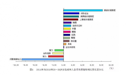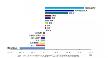 与2010年相比,2014年20~39岁男性成年人的皮褶厚度(肩胛部和腹部)、俯卧撑、腰围、臀围、胸围、体重、身高、纵跳、肺活量等指标有所增长,幅度在0.0%~17.0%之间;闭眼单脚站立、背力、握力、坐位体前屈、选择反应时、上臂部皮褶厚度、台阶指数等指标有所降低,幅度在0.7%~10.8%之间(图3)。