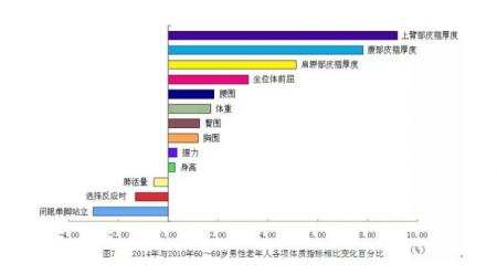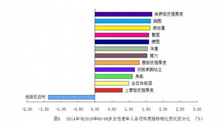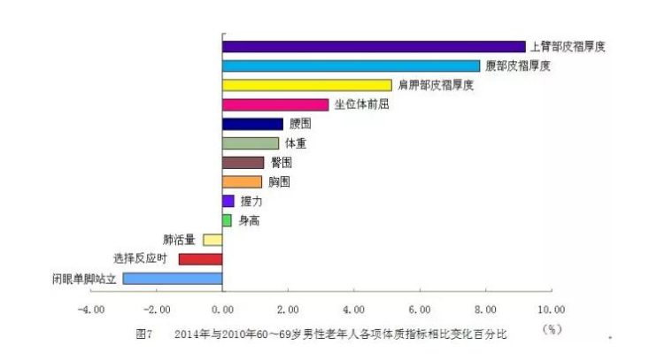 4、老年人与2010年相比,2014年60~69岁男性老年人皮褶厚度(上臂部、肩胛部和腹部)、坐位体前屈、腰围、体重、臀围、胸围、握力、身高等指标有所增长,幅度在0.3%~9.2%之间;闭眼单脚站立、选择反应时、肺活量等指标有所降低,幅度在0.6%~3.0%之间(图7)。