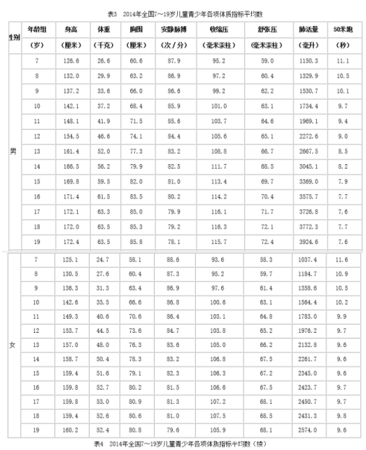 2、儿童青少年与2010年相比,2014年我国城乡学生身体形态发育水平,即身高、体重和胸围等发育水平继续提高。肺活量继2010年出现上升拐点之后,继续呈现上升的趋势。城乡学生营养不良检出率进一步下降,且基本没有重中度营养不良。乡村小学生蛔虫感染率持续降低。中小学生身体素质继续呈现稳中向好趋势。但是,大学生身体素质继续呈现下降趋势,视力不良检出率仍然居高不下,继续呈现低龄化倾向,各年龄段学生肥胖检出率持续上升(详见《2014年全国学生体质与健康调研结果)。
