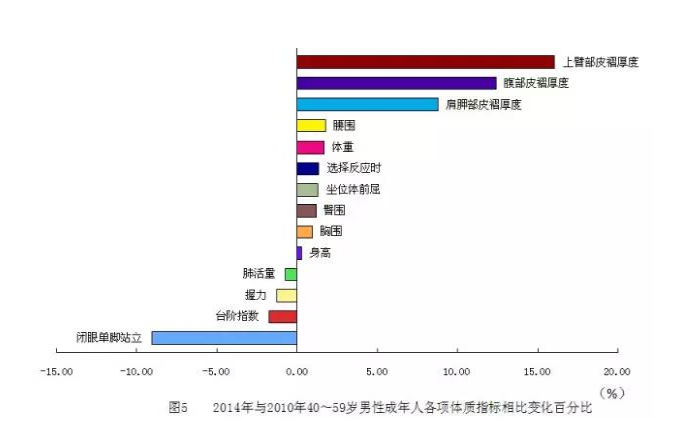 与2010年相比,2014年40~59岁男性成年人的皮褶厚度(上臂部、肩胛部和腹部)、腰围、体重、选择反应时、坐位体前屈、臀围、胸围、身高等指标有所增长,幅度在0.3%~16.4%之间;闭眼单脚站立、台阶指数、握力、肺活量等指标有所降低,幅度在0.7%~9.0%之间(图5)。