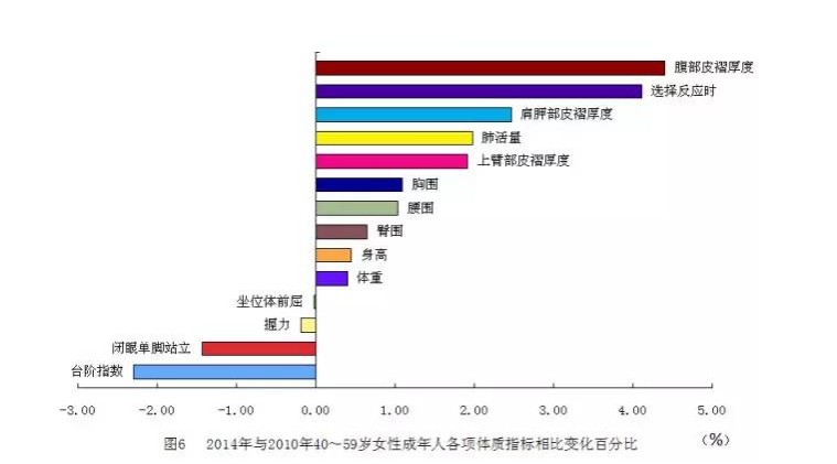 40~59岁女性成年人的皮褶厚度(上臂部、肩胛部和腹部)、选择反应时、肺活量、腰围、胸围、臀围、身高、体重等指标有所增长,幅度在0.4%~4.4%之间;坐位体前屈、握力、闭眼单脚站、台阶指数等指标有所降低,幅度在0.0%~2.3%之间(图6)。