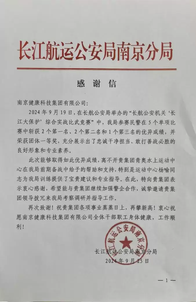 2024-10-14 10 4052024年10月12日上午,长航公安局的代表莅临健康科技公司,郑重递交了一封饱含深情的感谢信。在9月份,长航公安局的参赛民警在青奥水上运动中心·羊山湖基地(以下简称“羊山湖基地”)开展了紧张而有序的备赛训练。得益于羊山湖基地工作人员及教练团队的宝贵建议和专业指导,以及参赛民警的不懈奋斗和顽强拼搏,他们在9月19日的竞赛中经过激烈的角逐,最终南京分局荣获团体一等奖,展现了参赛民警的风采和精神风貌。