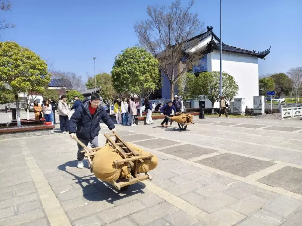 看似简单的推独轮车实际操作起来却有一定难度,党员们推着小车奋力疾行,一旦速度放缓或调整方向,就会失去平衡。通过这次体验活动,大家深刻感受到在交通并不发达的战争年代,老百姓用独轮车为解放军送军粮的艰辛,这份军民携手、共克时艰的深厚情谊,深深烙印在党员们心间。