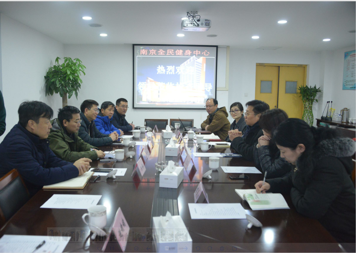 2018年1月25日上午,玄武区委常委、统战部部长朱天龙,区委统战部副部长、侨台办主任钟文舟等领导冒雪调研了南京全民健身中心,与集团党委书记、董事长章小奇,副总经理王虹燕等领导进行工作座谈,积极探索统筹整合双方资源,推动基层党建从生活社区向产业社区拓展。朱天龙部长一行人参观了南京全民健身中心一楼大厅、长青跆拳道馆、艺之行、游泳馆和乒乓球馆等场馆,对中心运营情况给予充分肯定,希望中心进一步结合自身优势,按照社会化运作思路,大胆探索,认真研究,在区委统战部的帮助指导下做好健身教练、体育产业经营者等新的社会阶层人士统战工作的方式方法,尝试打造具有中心特色的“新领空间”统战工作实践创新基地。