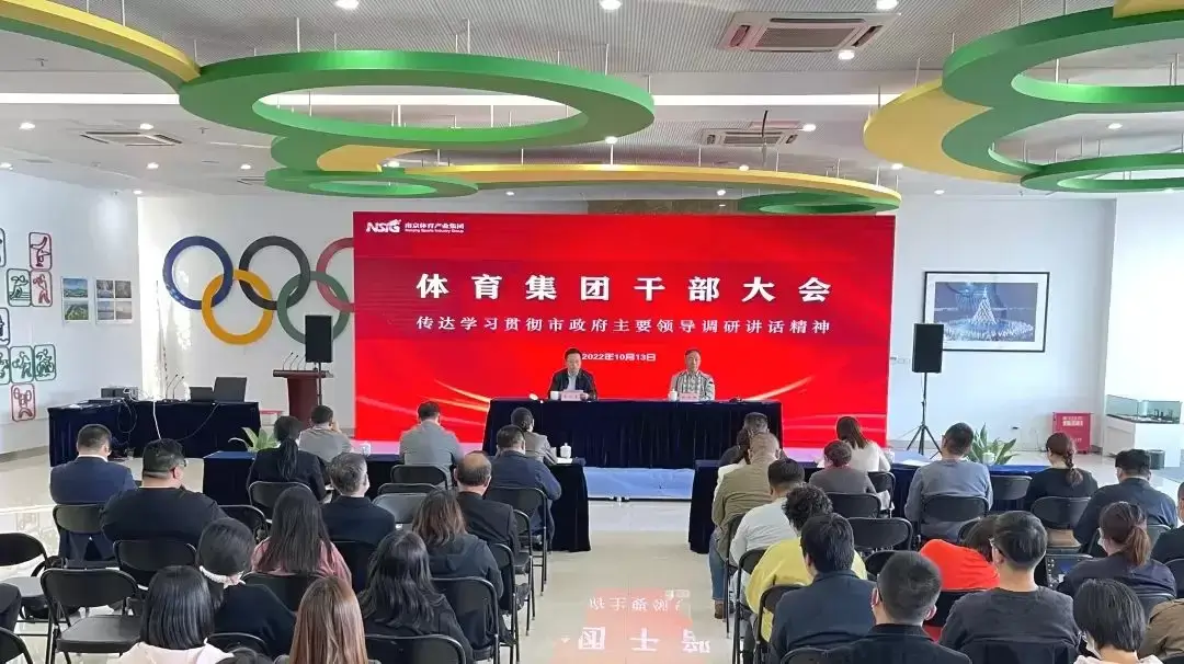 2022-10-16 10 34210月13日,市体育集团在青奥体育公园召开集团干部大会,传达学习贯彻市政府主要领导调研讲话精神,全面部署集团大局工作,围绕冲刺全年目标任务提出具体要求。集团班子成员、各部门负责人及各子企业中层以上干部参会。