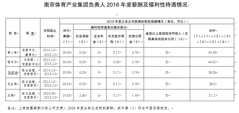 南京体育产业集团负责人2016年度薪酬及福利待遇情况