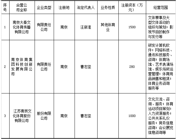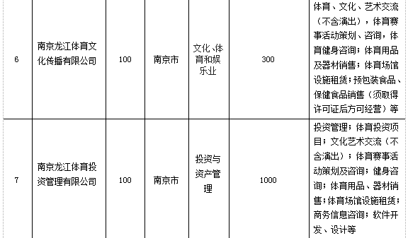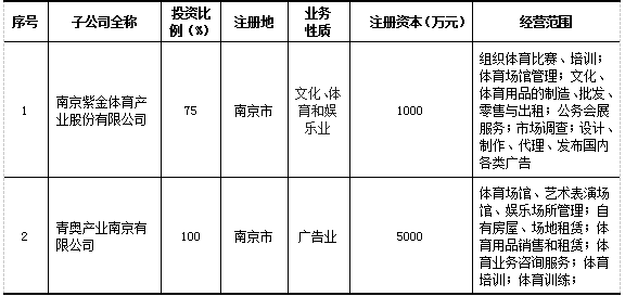 经营范围:体育业务咨询、服务;组织体育比赛、训练、培训;体育场馆、艺术表演场馆、娱乐场所管理;举办文体娱乐活动、体育赛事服务;体育用品销售、租赁;物业管理;自有房屋、场地出租;设计、制作、代理、发布国内各类广告;体育、文化艺术经纪代理;游览景区管理;电子交易平台技术服务。(依法须经批准的项目,经相关部门批准后方可开展经营活动)