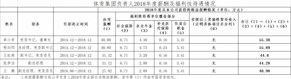 » (年度公开-年度报告)体育集团负责人2018年度薪酬及福利性待遇情况
