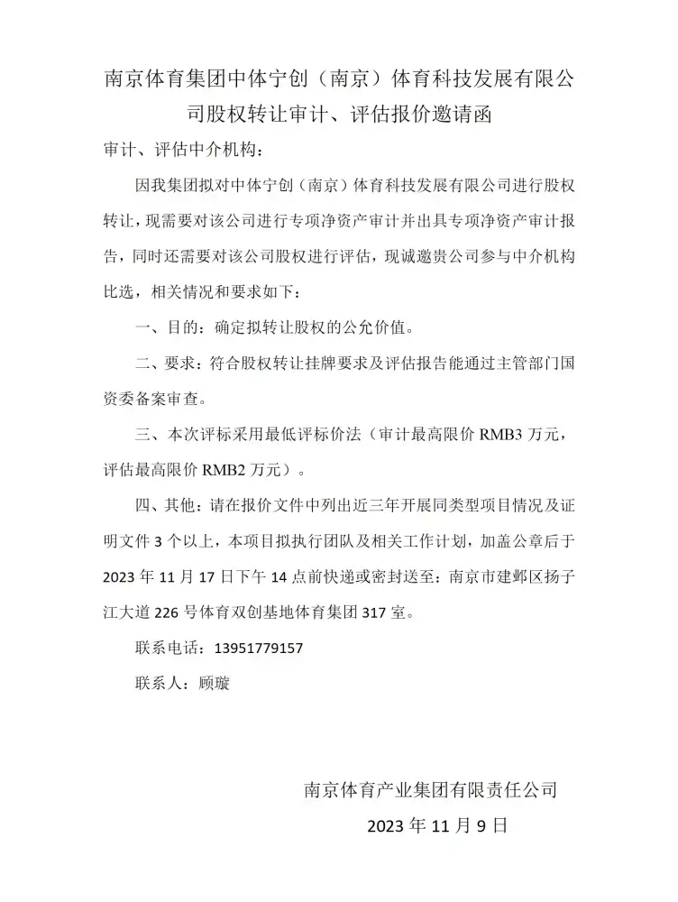南京体育集团中体宁创(南京)体育科技发展有限公司股权转让审计、评估报价邀请函