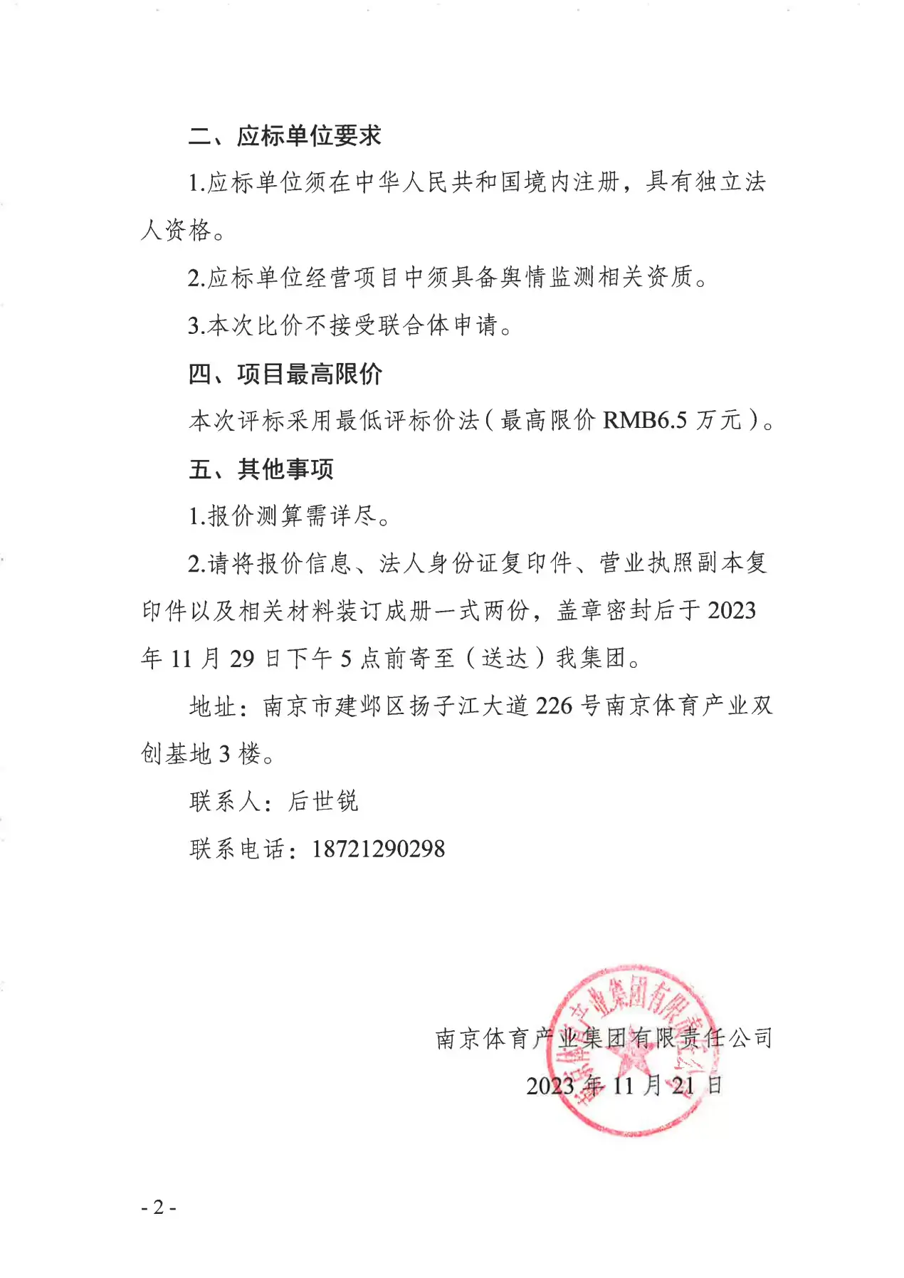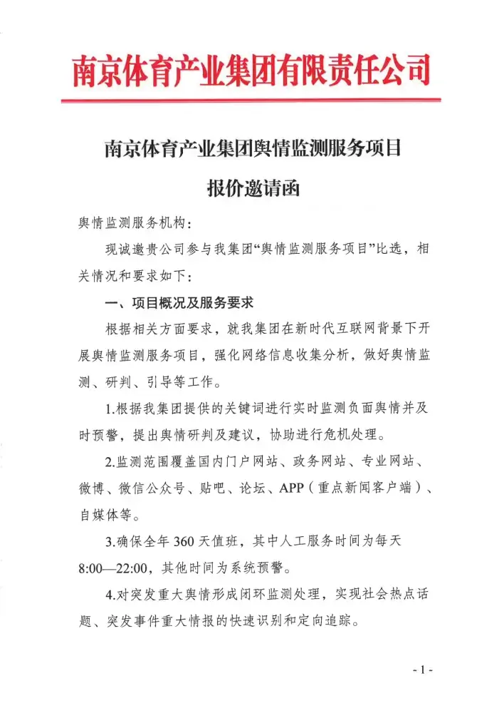 » 南京体育产业集团舆情监测服务项目报价邀请函
