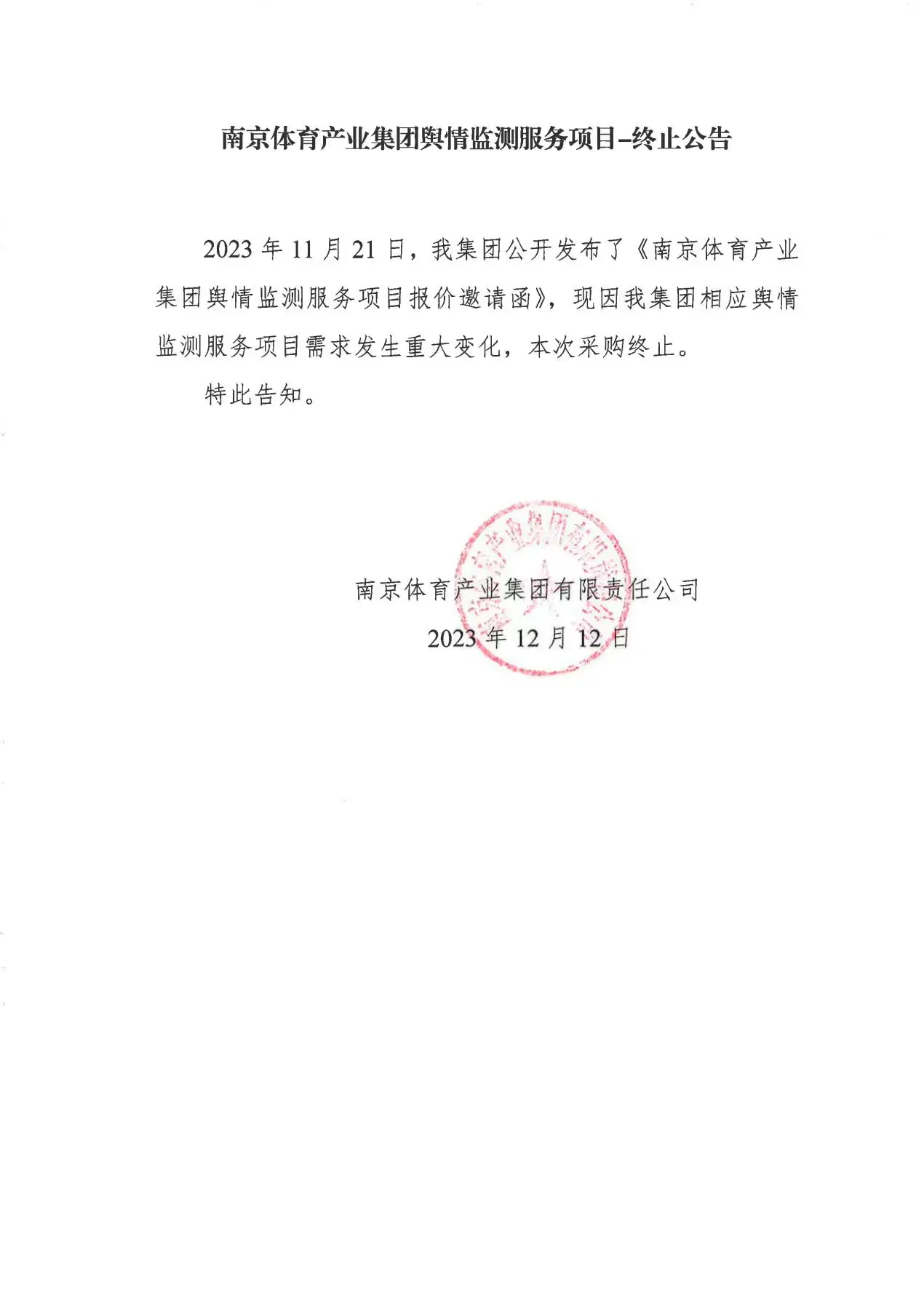 » 南京体育产业集团舆情监测服务项目-终止公告
