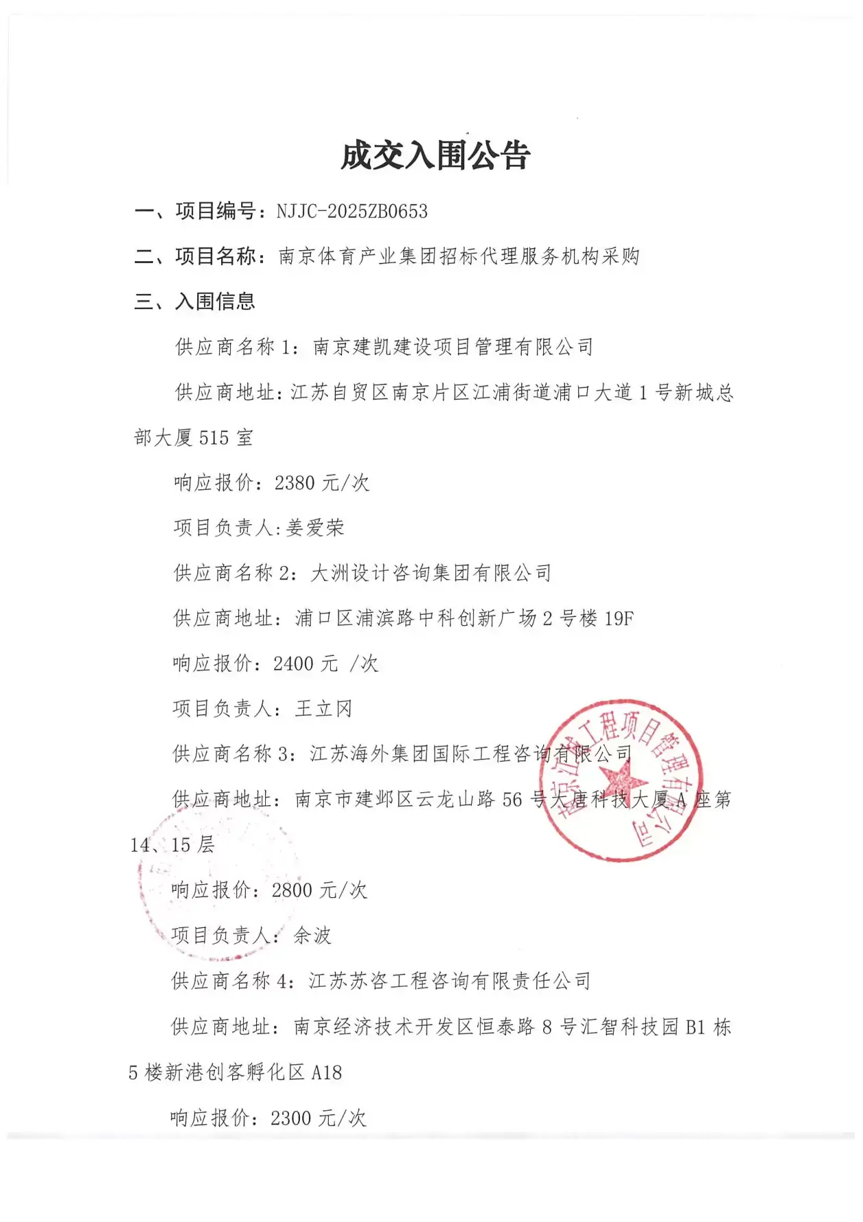 » 南京体育产业集团招标代理服务机构采购项目成交结果公告