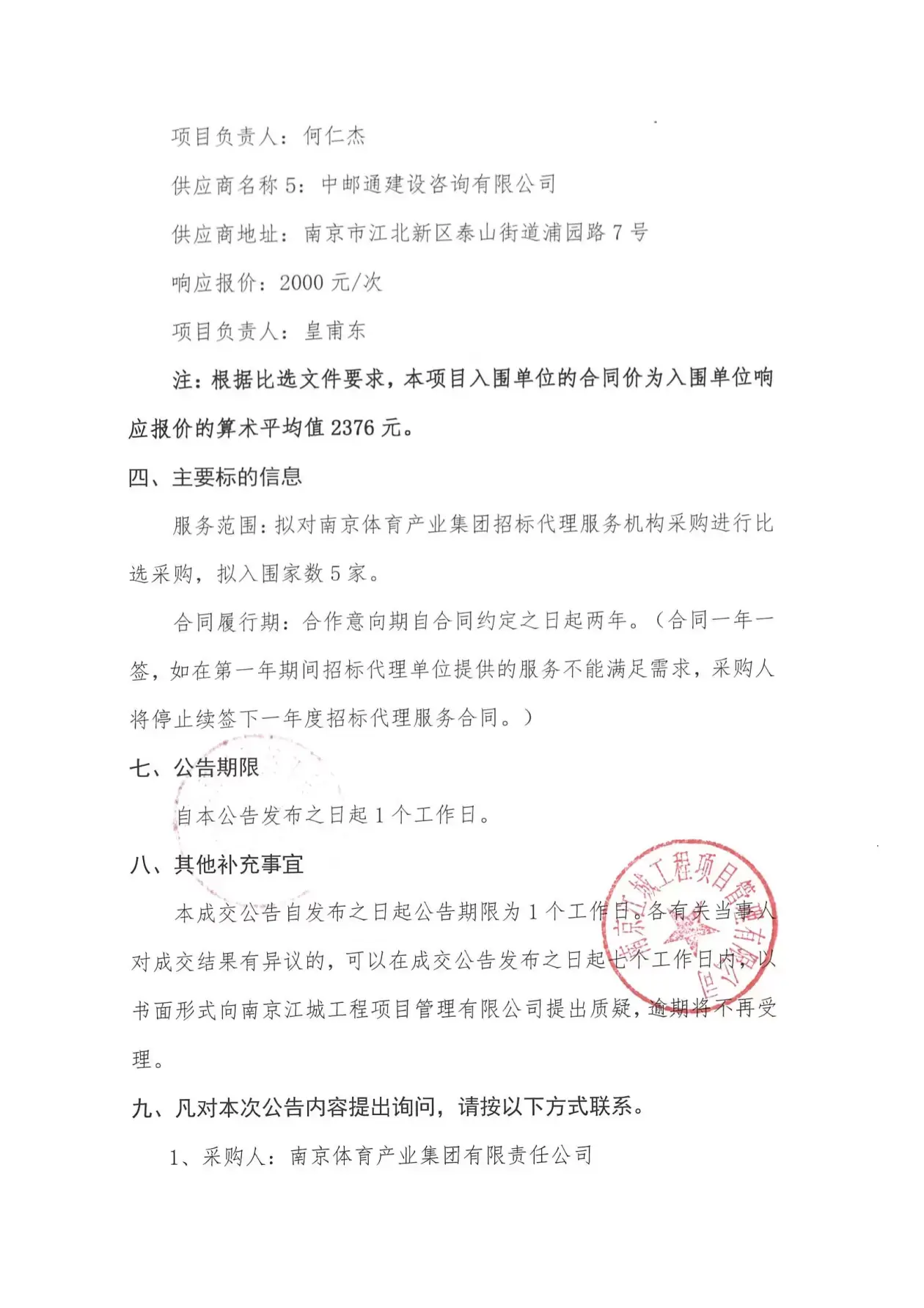 南京体育产业集团招标代理服务机构采购项目成交结果公告