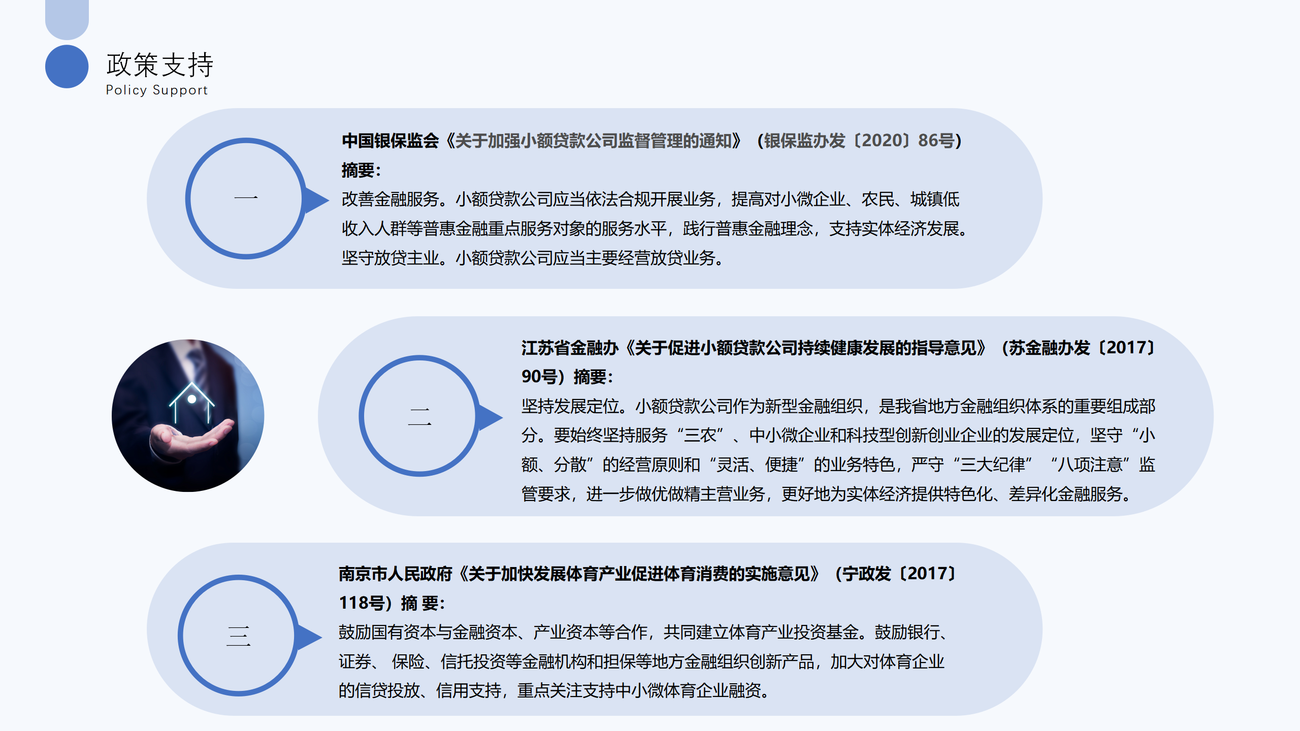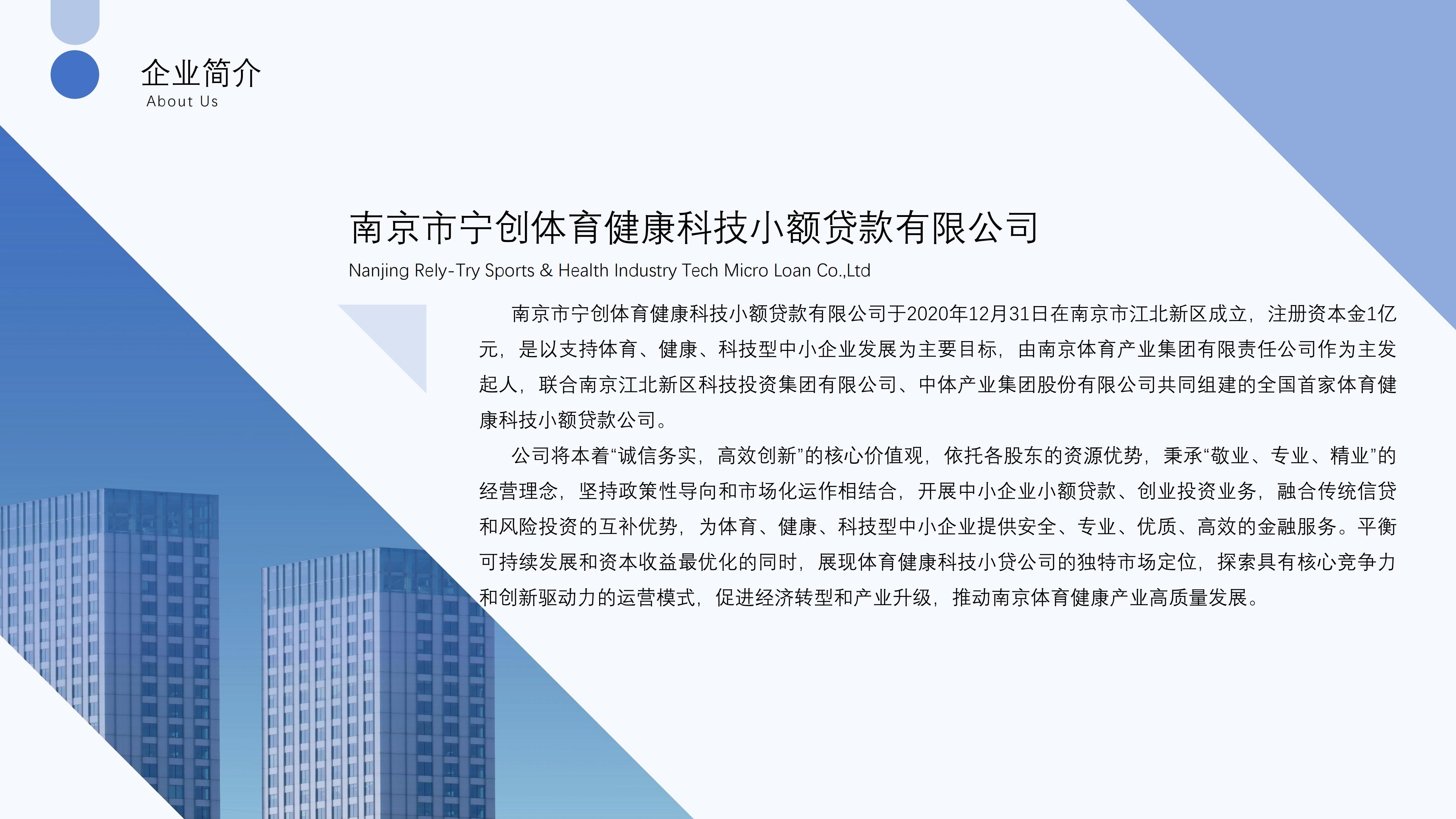 南京市宁创体育健康科技小额贷款有限公司成立于2020年12月,注册资本金1亿元,是由开云体验app官方入口控股(占股55%)、南京江北新区科技投资集团有限公司(占股30%)、中体产业集团股份有限公司(占股15%)参股的全国首家体育健康科技小额贷款公司。公司秉持“诚信务实,高效创新”的核心价值观,贯彻“敬业、专业、精业”的经营理念,坚持政策性导向和市场化运作相结合,开展中小企业小额贷款、创业投资业务,融合传统信贷和风险投资等业务,致力于解决中小微企业融资难、融资慢等问题,为体育、健康、科技型中小微企业提供安全、专业、优质、高效的金融服务,成立以来已为170余家企业累计提供超4亿元资金支持,在全省444家小额贷款公司中获评行业监管评级最高等级A级。