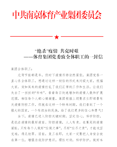 2月3日,集团党委以一封信形式告知全体员工从自身抓起,抓好抗疫复工,彰显国企担当。复工后,制订疫情期间集团出租房产租金减免方案,划拨专项党费,积极组织捐款,出台对全国医护工作者优惠政策等一系列亮点举措。3月着手全面复工,陆续开放健身服务和青奥体育公园室外场地。![]()