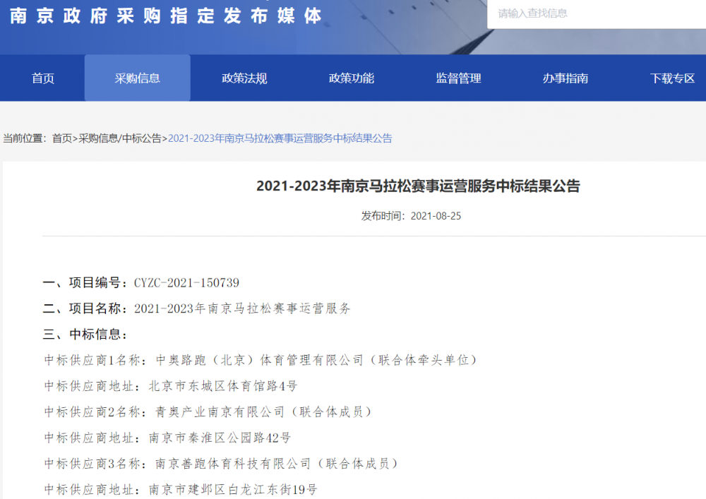 2021-09-13 4 3458月25日下午,南京公共采购信息网发布《2021-2023年南京马拉松赛事运营服务中标结果公告》。南京体育产业集团旗下青奥产业南京有限公司携手中奥路跑(北京)体育管理有限公司及南京善跑体育科技有限公司成功中标2021—2023南京马拉松赛事运营权。在此期间,联合体将以专业、匠心的精神为标准,将南京马拉松打造成为国际田联金标赛事。![]()