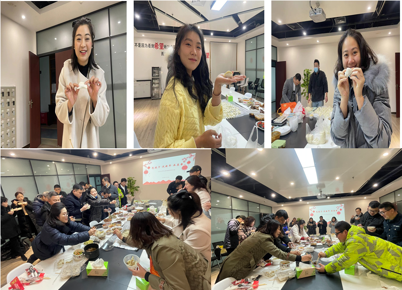 中午10:00活动开始,公司员工聚集全民健身中心6楼会议室,挽起衣袖,清洗食材、器具、锅盆,随后围在一起,人人动手、各显神通,擀饺子皮、拌馅儿、包饺子,过程中大家唠起家常、拉近感情。不一会,自己动手包的造型各异的饺子摆满了桌面,有敦实厚重的,有别致精巧的,有南北形状的饺子,还有四色水饺、特殊馅的水饺,真是五味俱全,让人食指大动。大家纷纷给自己的“作品”拍照留念。煮熟了饺子后,大家拿出自带的美食一起分享,吃着自己包的饺子格外香甜。![]()