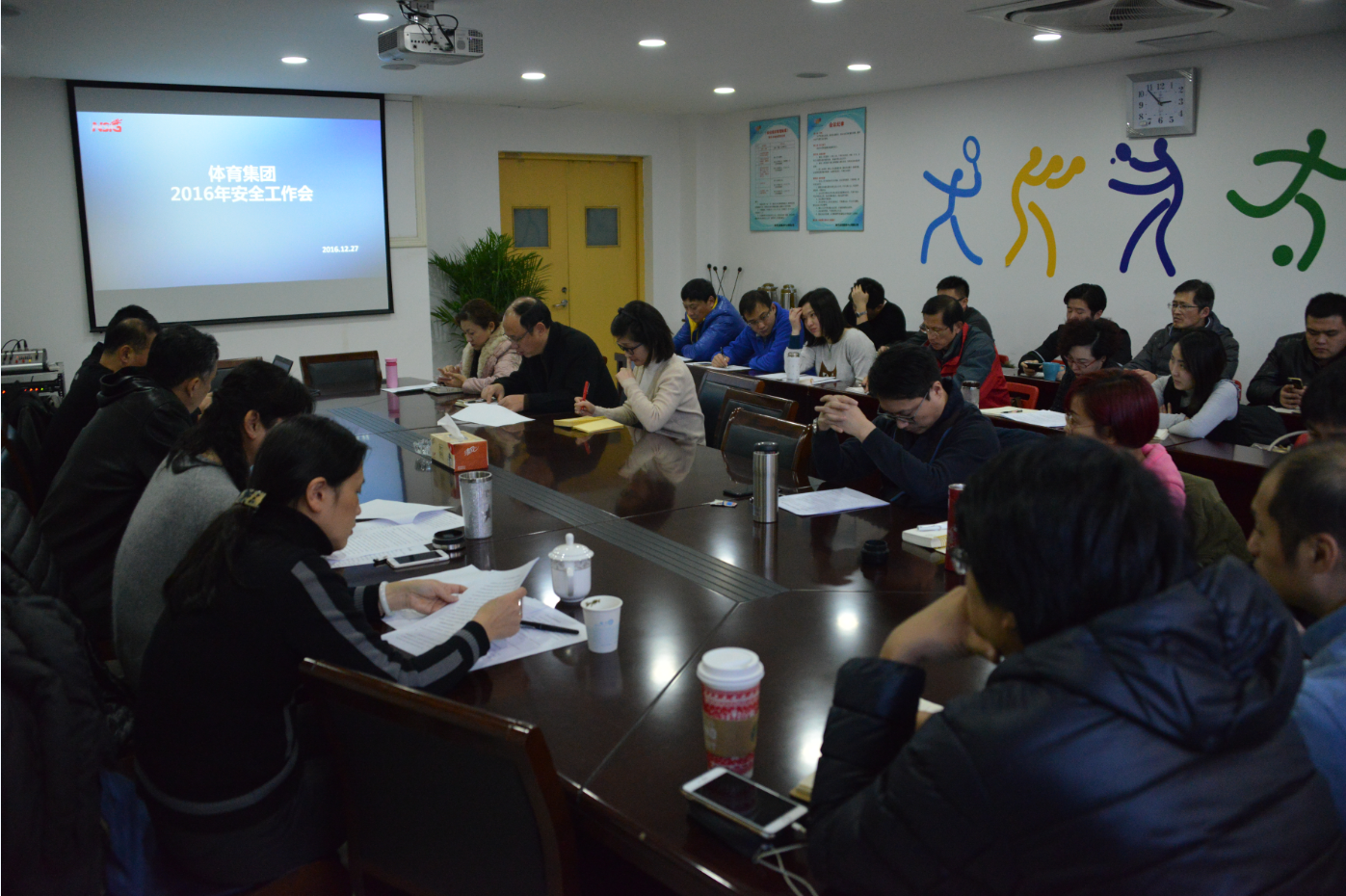 为认真贯彻国家和省市安全生产工作会议精神,严格落实企业安全生产主体责任,在新的一年筑牢安全防线,12月27日下午,南京体育产业集团在全民健身中心会议室召开了2016年度安全工作会,集团总经理程向阳、集团副总经济师周培源、集团资产运营部、下属公司领导班子全体成员、部门负责人及专兼职安全工作人员等27人参加会议。会议由集团安全总监、副总经理王虹燕主持。会议首先解读了中共中央、国务院日前出台的《关于推进安全生产领域改革发展的意见》,组织学习《企业安全生产责任体系五落实五到位规定》,观看安全事故案例警示片,强调了在安全工作中血的教训决不能再用鲜血去验证。