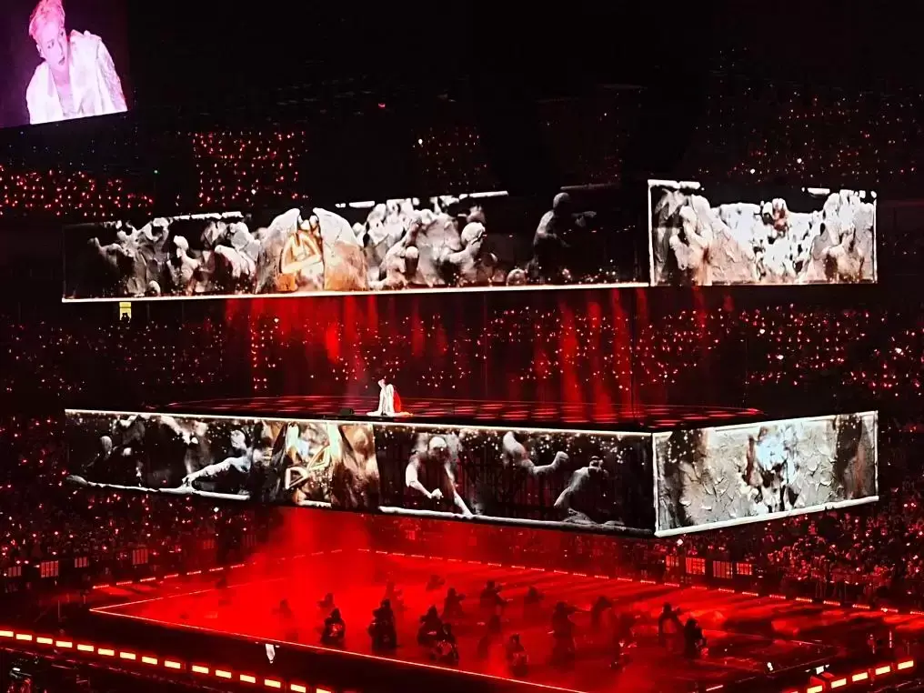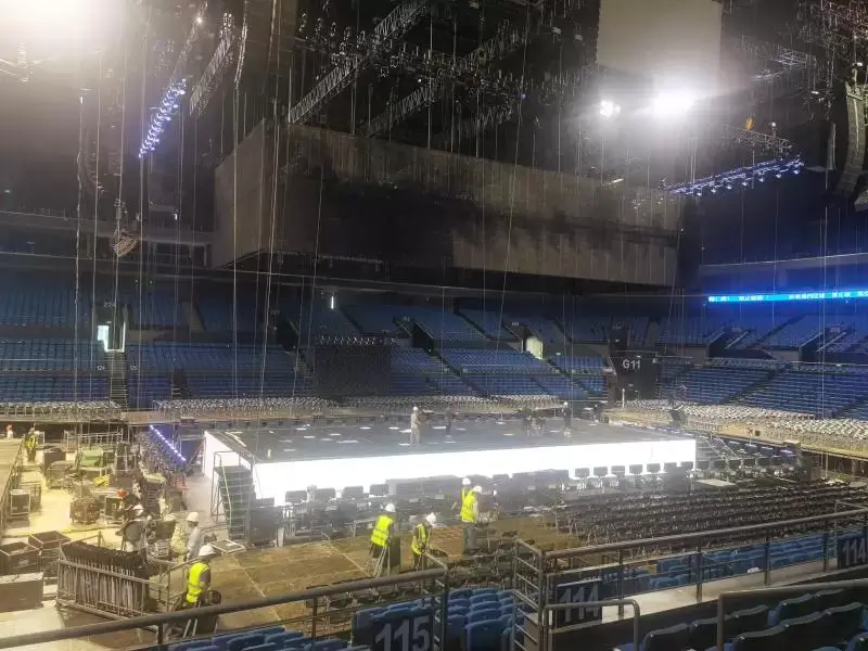 本次演唱会采用了四面台设计,设计吊点59个,挂载重量达65吨,总用电功率高达1300千瓦。本次演唱会是青奥体育公园今年首场采用无支柱设计、可实现多层舞台升降的重量级演出,舞台高度近17.90米,打造三层立体漂浮舞台,重新定义了四面台舞台结构,这不仅打破了舞美设计的传统边界,也打破了空间维度的限制。
