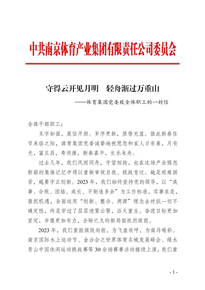 守得云开见月明 轻舟渐过万重山——体育集团党委致全体职工的一封信