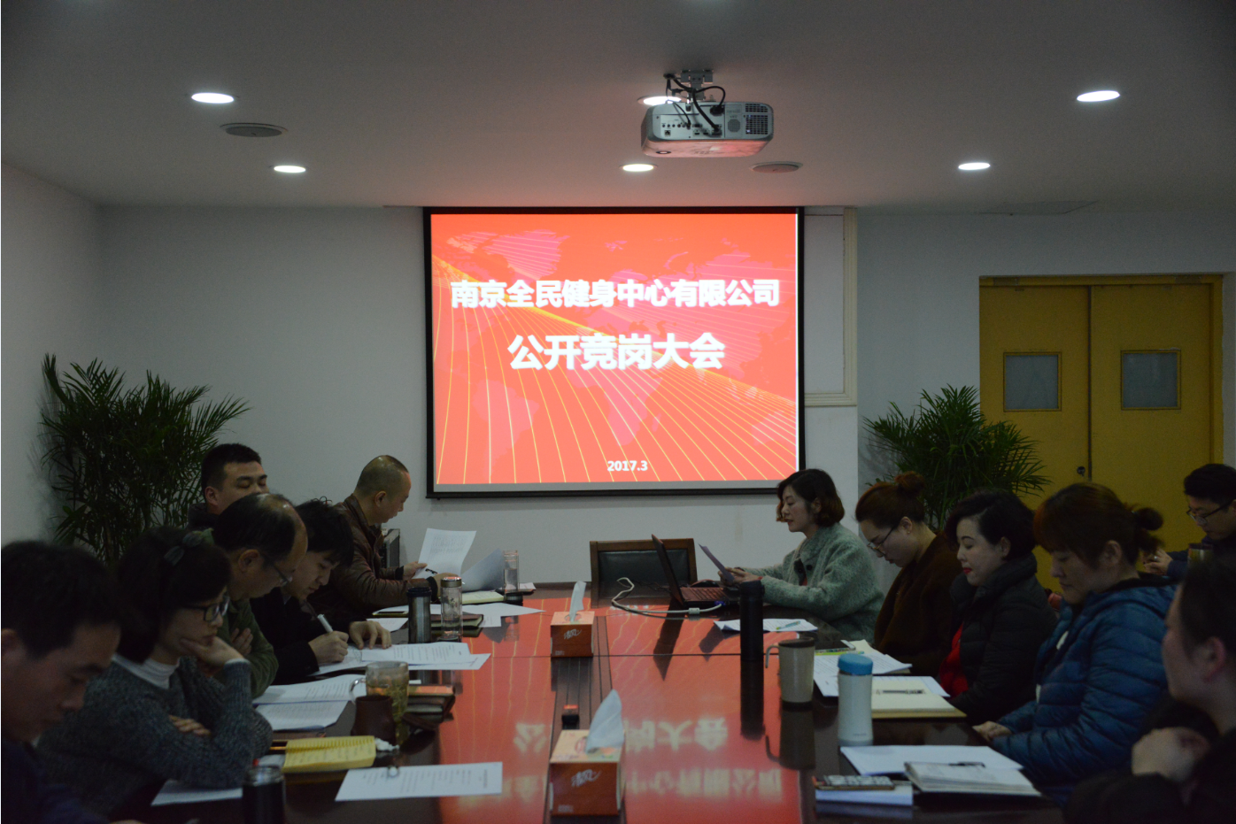 根据南京体育产业集团战略规划和年度务虚会部署,南京全民健身中心有限公司未来发展定位为“管理输出,品牌连锁”。为建立与之相匹配的用人机制,鼓励公司内部人才的合理流动和有效配置,以适应激烈的市场竞争需要,近期全民健身中心公司开展了全员竞聘上岗工作。根据干部人事工作要求,经过酝酿、动员、通知、报名、筛选、公示等规范程序,2017年3月2日下午,全民公司全员公开竞岗大会如期举行,集团纪委张金发书记出席,集团人力资源部、联合党支部相关人员以及全民公司领导班子成员担任评委,集团联合监督办全程监督公开竞岗过程。全民公司所有参竞人员参加了会议。