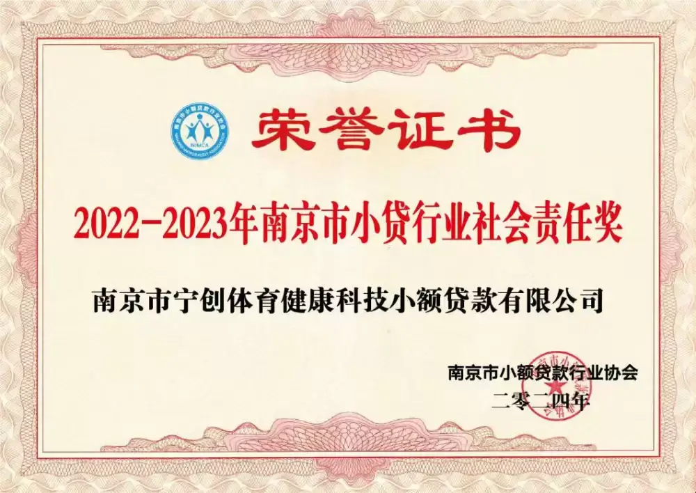 近日,南京市宁创体育健康科技小额贷款有限公司荣获南京市小额贷款行业协会颁发的“2020-2021年南京市小贷行业社会责任奖”。