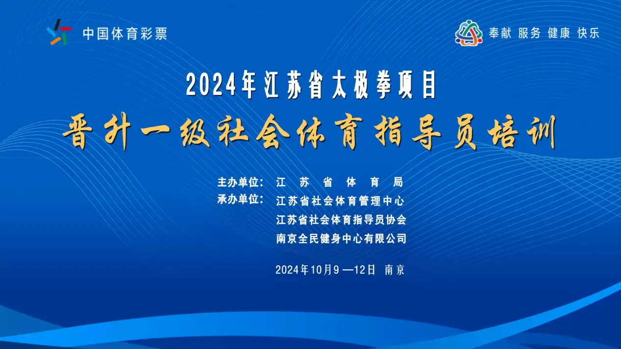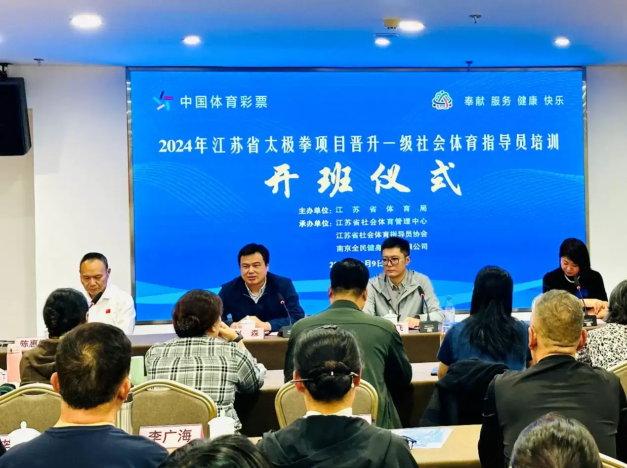 2024-10-14 2 46110月9日-12日,由江苏省体育局主办,江苏省社会体育管理中心、江苏省社会体育指导员协会、南京全民健身中心有限公司(以下简称“全民公司”)共同承办,中国体育彩票提供资助的2024年江苏省太极拳项目晋升一级社会体育指导员培训活动在南京举行。江苏省社会体育管理中心主任刘森、全民公司执行董事许晨飞出席开班仪式。