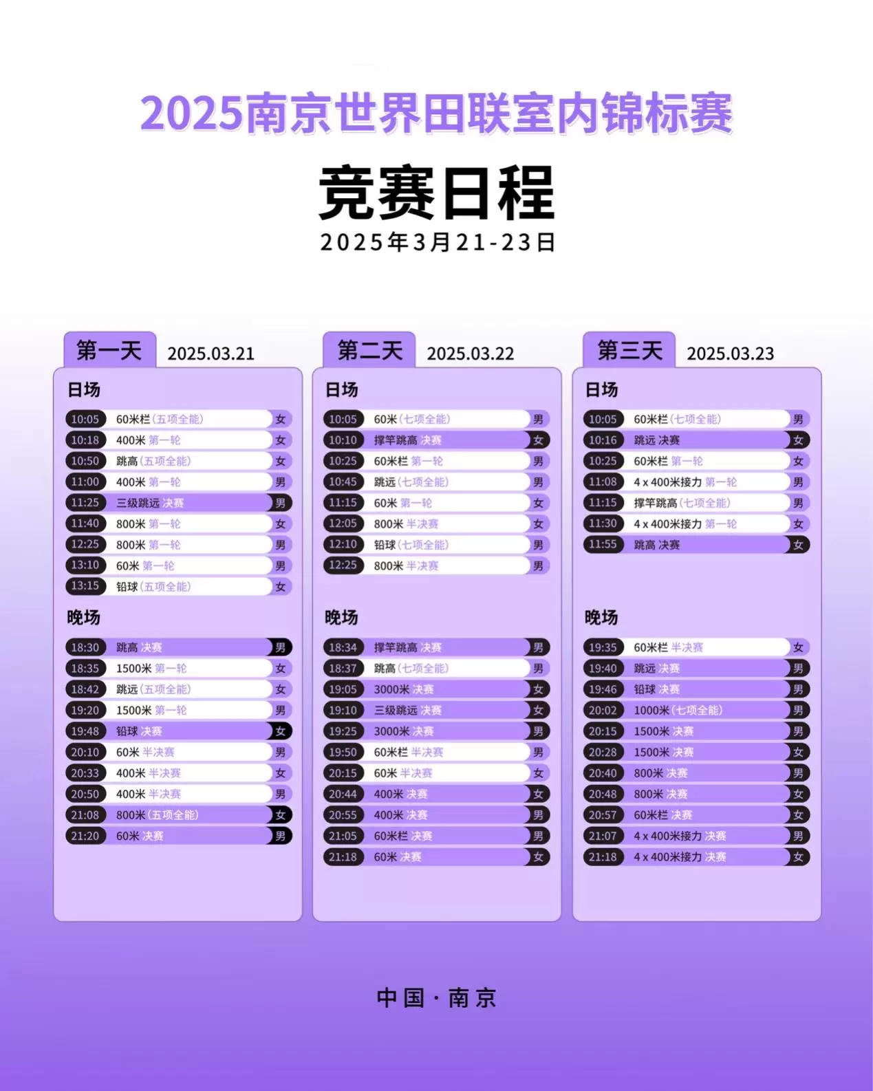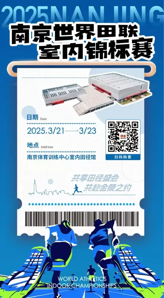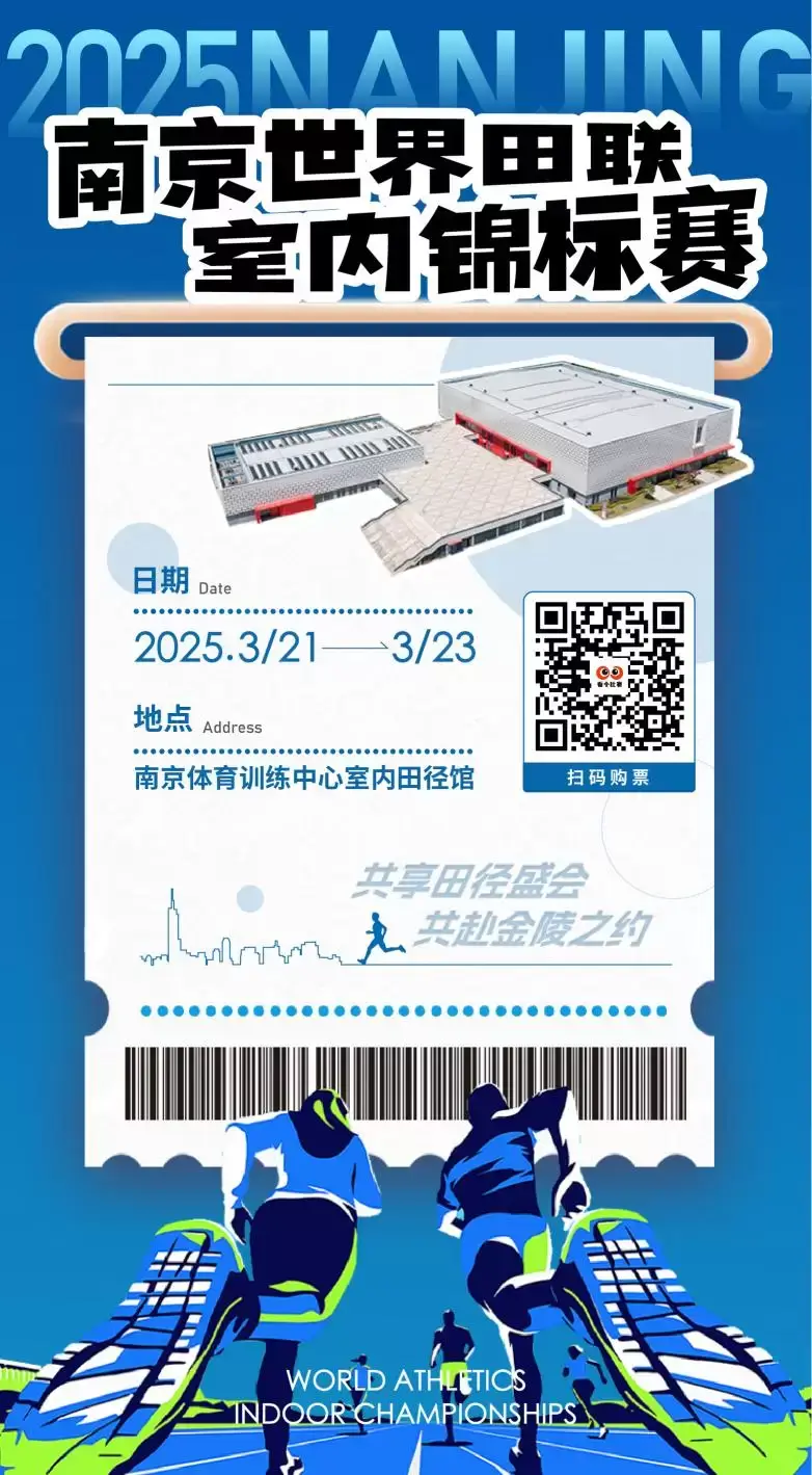 2025-01-3 2 7762025年1月1日中午12:00起,2025南京世界田联室内锦标赛门票将正式开售。即日起,市民可在微信/支付宝/搜索“看个比赛”小程序或下载“看个比赛”APP,抖音搜索“2025南京世界田联室内锦标赛”进入售前预览,先行了解相关票务信息。