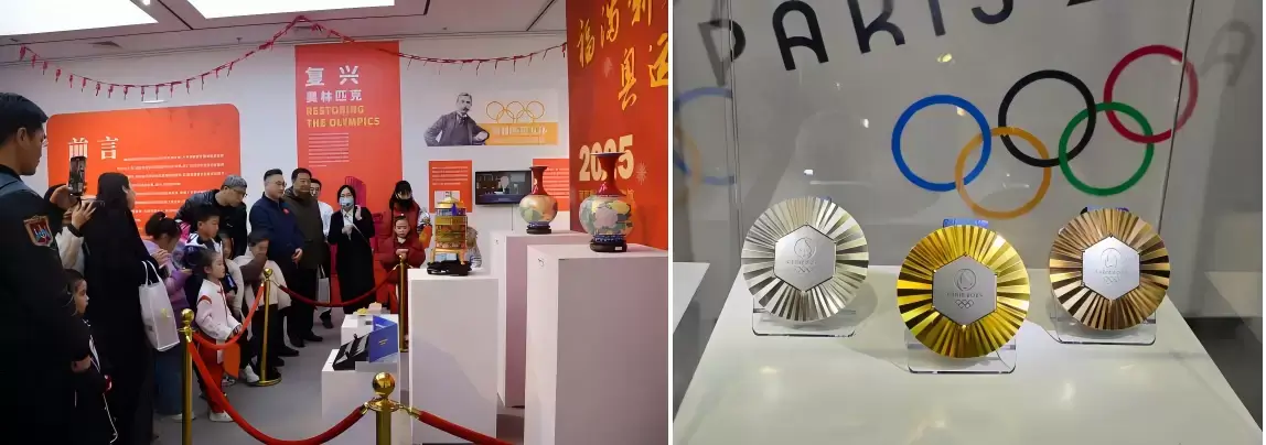 此次展览分为复兴奥林匹克、体育名宿、体育赛事、奥运艺术四个单元,其中巴黎奥运会火炬、奖牌、C罗签名球衣、洛杉矶银河足球队签名球衣等展品则是首次亮相展出;而南京青奥会百福瓶、北京奥运会中国红大瓷瓶、北京冬奥会五环珐琅尊、哈尔滨亚冬会五福临门水晶冰壶套装,以及五十六个民族图腾和传统体育项目剪纸作品等富有“年味”的体育文化展品,更是为新春佳节增添一份独特的体育文化气息。