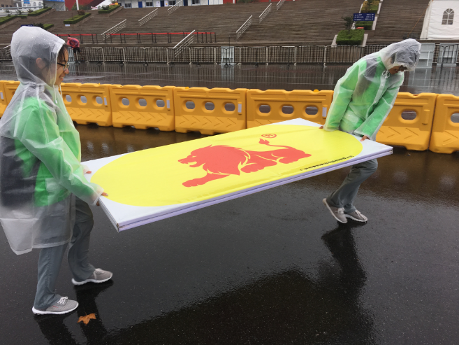 全力以赴攻坚克难。赛时体育产业集团开展了一系列赞助商服务工作,做到全力保障、全员服务、持续对接,为赞助商及参展商提供板车运输、板房寄存等增量服务。开幕式前夕和公路赛与马拉松转场之夜,体育产业集团通宵作业,根据既定方案及现场流线实施赞助商展示职能。9月16日公路赛受暴雨影响,部分临设与景观出现渗水及损坏等险情,为保障赞助权益,市场开发部各组人员协同志愿者对FOP区、赞助商展示区、参展售卖区、特许经营区及餐饮售卖区的广告位与展示售卖产品进行抢救保护,全体组员服从指挥,万众一心,奋勇争先,忘我奉献,以强烈的责任感与使命感保障各项工作顺利完成,使得赞助商的财产顺利保护转移。