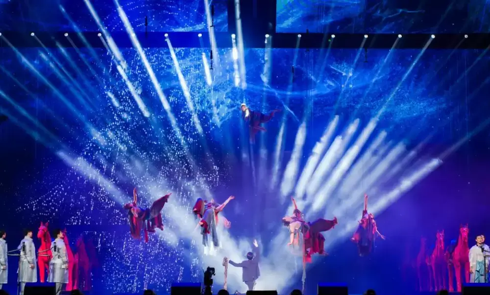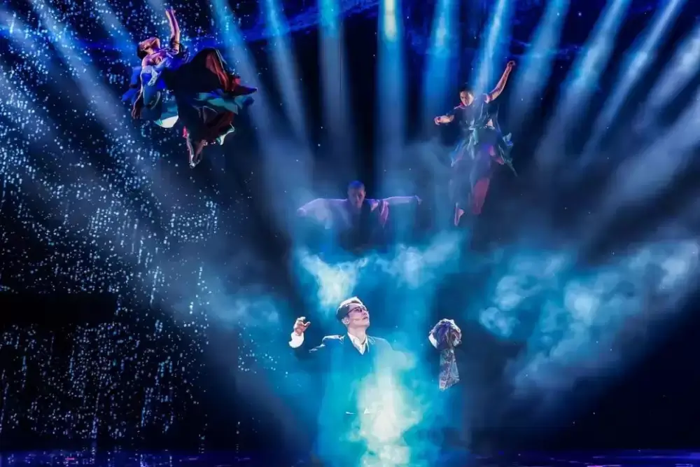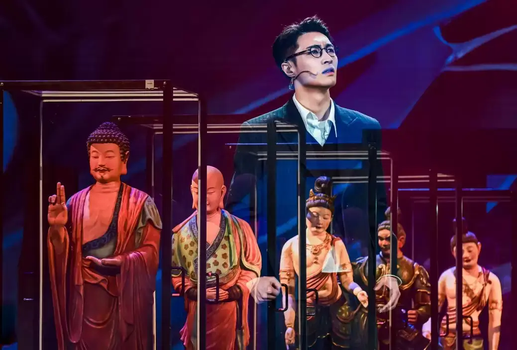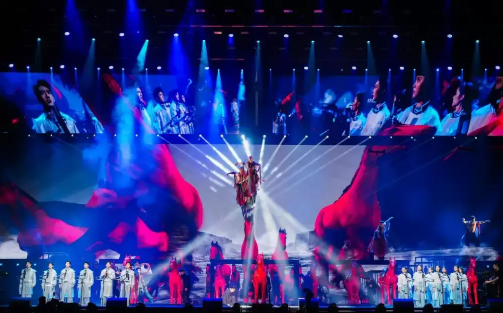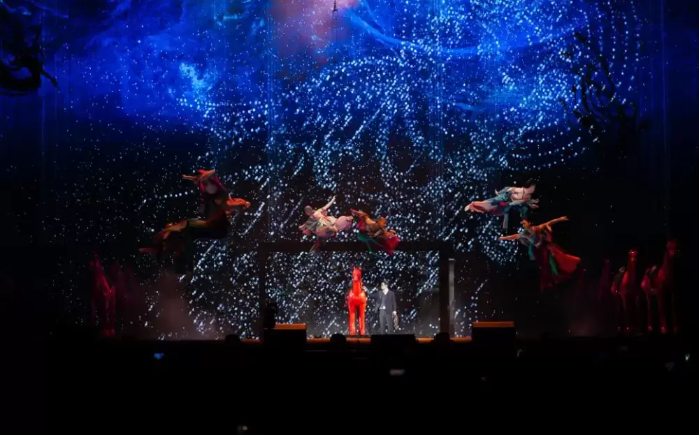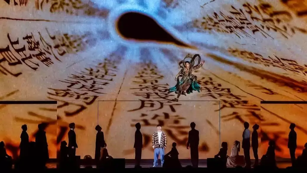 演出现场,舞台宛若“戏剧元宇宙”降临,以前沿科技赋能艺术表达。敦煌“活”了!高清数字技术让裸眼3D壁画从洞窟“走”进体育馆,佛陀垂目、飞天旋舞。60米巨幕如天幕垂落,15米高纱幕投影庄严佛造像,700余盏灯光编织梦幻光影,7路威亚牵引“飞天”翱翔苍穹。即时拍摄技术打破空间限制,演员特写直抵人心。15首风格多元的原创歌曲贯穿始终,音乐与戏剧完美交融,为古老敦煌注入澎湃的现代节拍。整场演出打破了戏剧、音乐、影视、演唱会的边界,堪称一场融合传统美学与前沿科技的视听盛宴。
