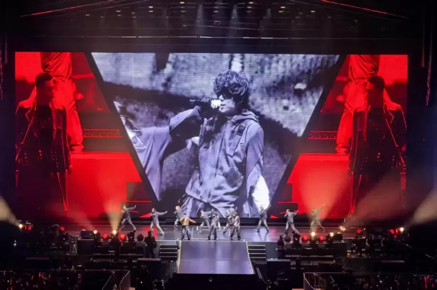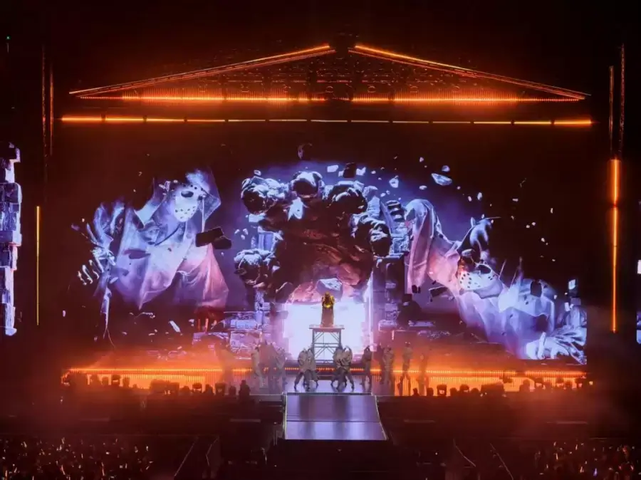 MC法老化身“星际信使”,以说唱连接时空,整个演出如一部宏大的音乐戏剧,分为<耳语>、<烽火>、<信件>、<集结>四个篇章,悬念迭起,结构精妙。舞台美学大胆革新,戏剧式灯光交互编织出流动的视觉诗篇,荧光如星轨倾泻,将现场浸入迷幻未来之境。音乐编排堪称颠覆性突破,弦乐与管乐的融入结合,流行舞与现代舞的碰撞与深度磨合,历经近一个月的精心锤炼,开创了国内说唱演唱会艺术呈现的新维度。