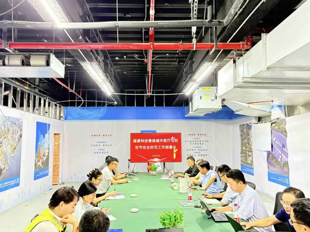 2025-09-28 418为深入贯彻落实上级关于中秋国庆假期安全工作的系列要求,切实压实假期安全防范责任,全力营造安全、稳定、有序的假日环境。9月26日,健康科技总经理林海涛在青奥城市客厅项目现场,主持召开中秋国庆期间安全防范专项部署会。会议结束后,总经理林海涛随即带队开展节前安全专项检查,项目监理单位、总包单位、设计单位等各参建方相关负责人全程参会并陪同检查。