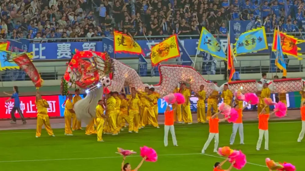 这是有 400 多年历史的国家级非遗“骆山大龙”。往常春节里,南京溧水村民会舞着它祈盼风调雨顺;而这天,巨龙追逐的不是传统龙珠,而是一颗黑白相间的足球,每一次腾跃都像在为南京队“开路”,把非遗的厚重与赛场的活力拧成了一股劲。