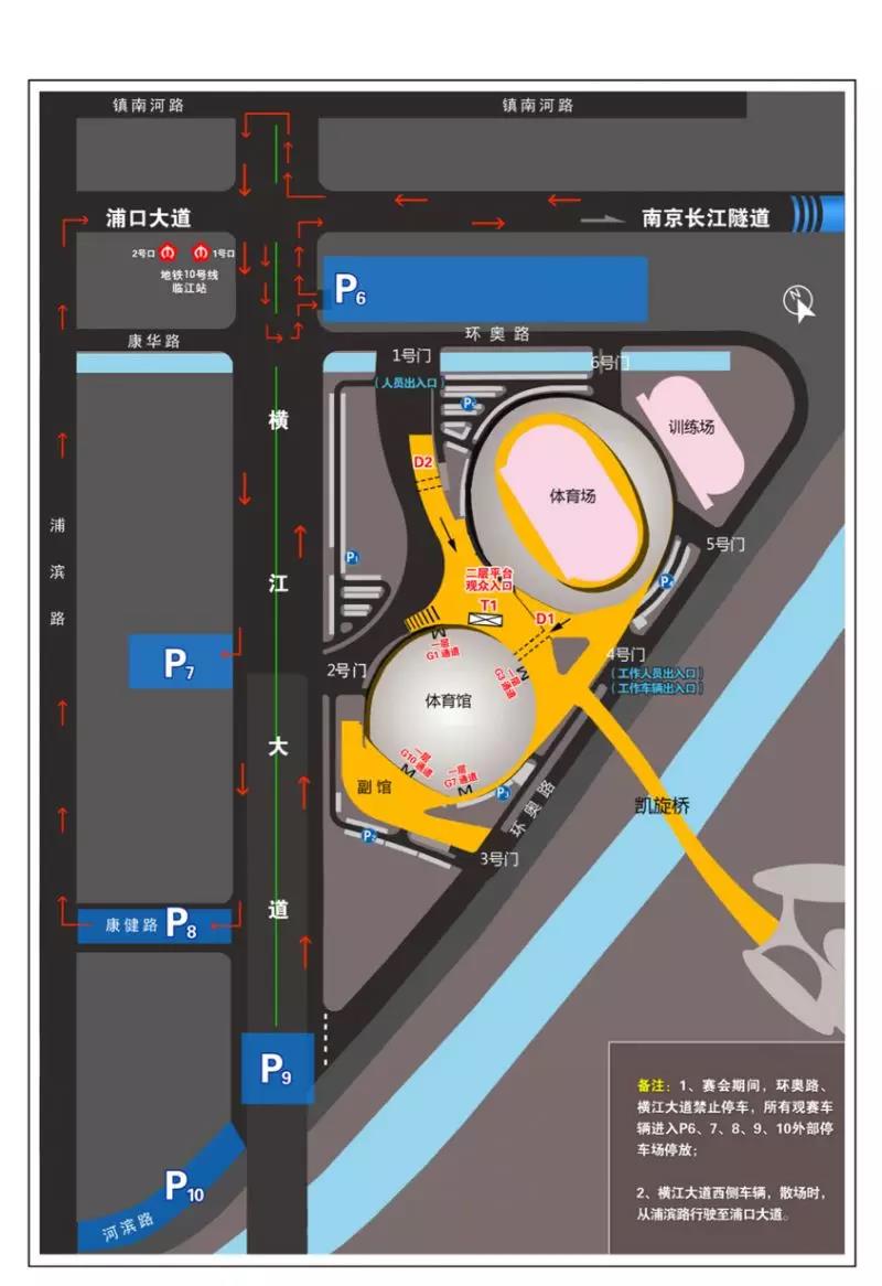 前往现场观赛的球迷如何进入场馆?据世锦赛组委会安全保障部工作人员介绍,羽毛球世锦赛比赛期间,环奥路、横江大道禁止停车,所有观赛车辆要进入P6、7、8、9、10停车场进行停放,青奥体育公园外这5个停车场预计可停车辆约3000余辆。为了有更好的观赛体验,建议广大球迷朋友搭乘地铁等公共交通工具前往观赛。同时,还要提醒的是,持票观众届时可从青奥体育公园1号门进入,沿台阶上二层平台,从二层平台T1通道进入体育馆内,到达看台区,观看比赛。(摘自东方卫报)(观赛交通引导图)
