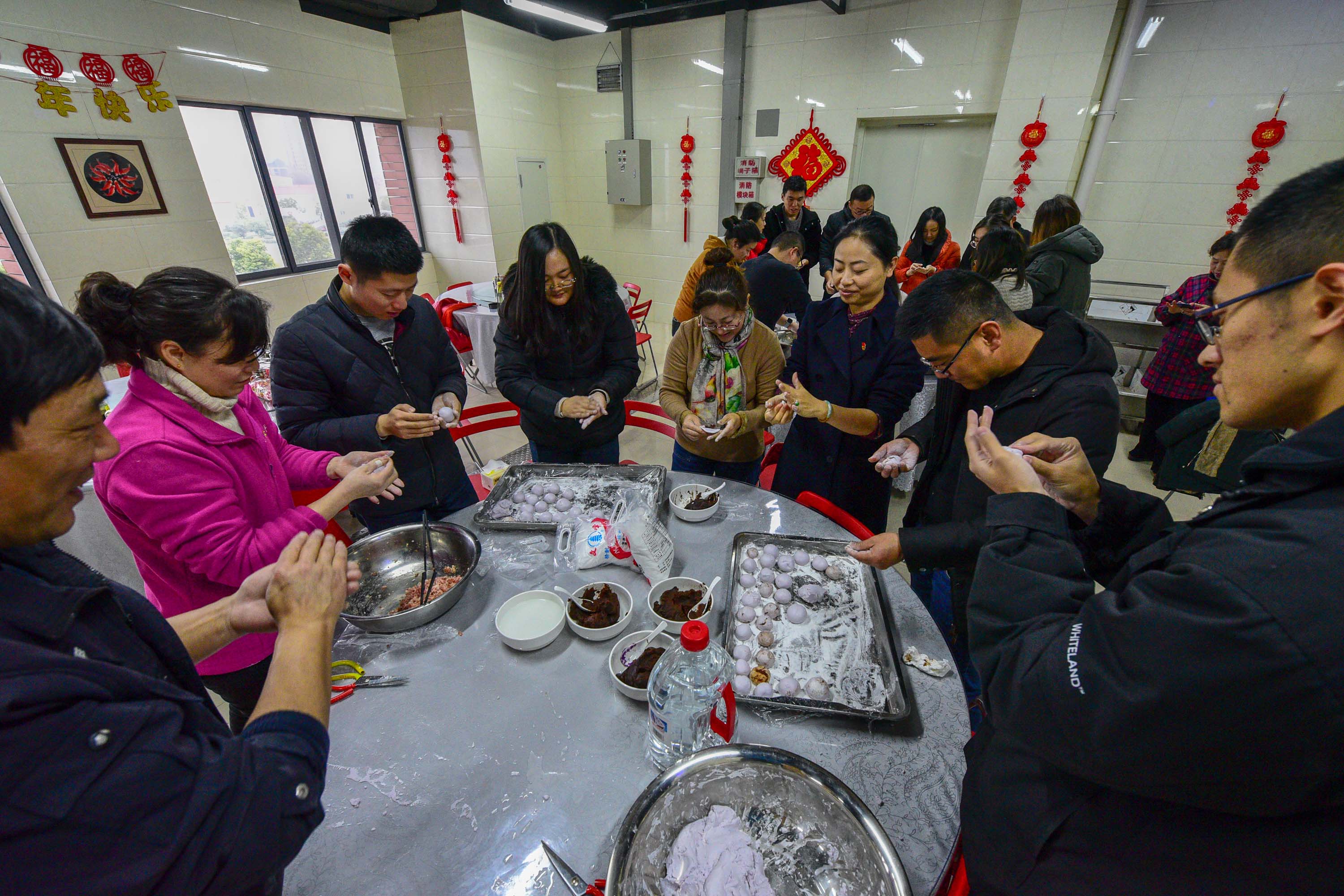 通过精心准备,大家纷纷挽起袖子,亮出了自家本领。食堂里热闹非凡,几位包汤圆的高手熟练地和面粉、揉面团、搓汤圆、放馅料、捏造型,年轻员工则在一旁认真学习、尝试,现场其乐融融。