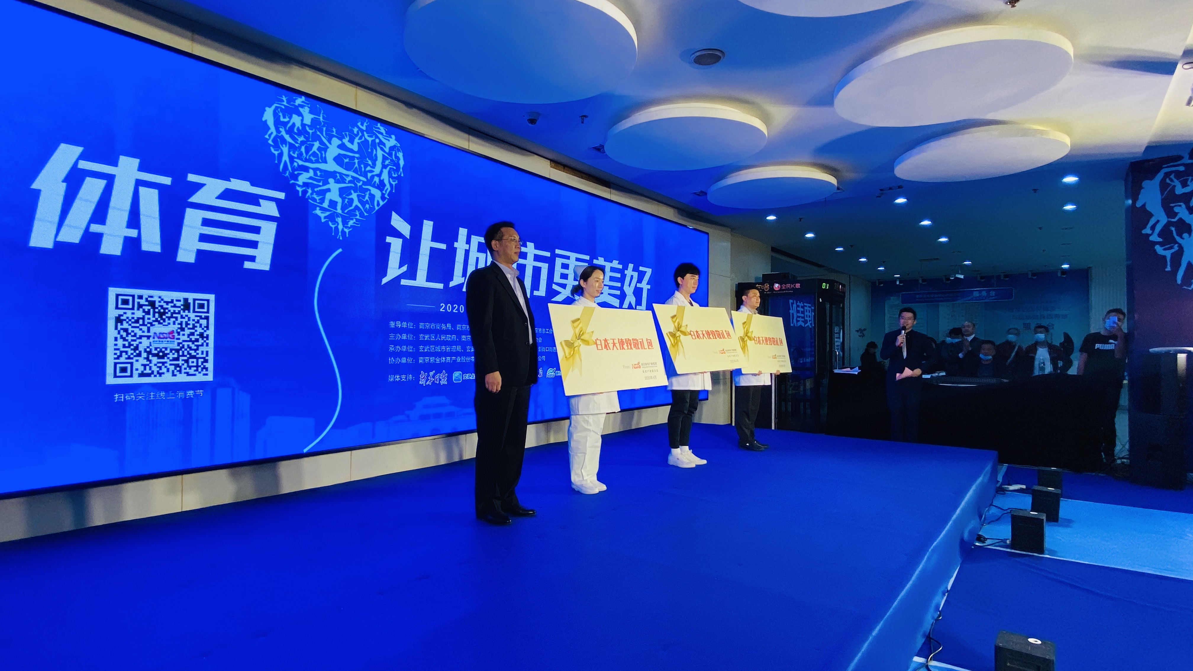 启动仪式现场还邀请到了鼓楼医院援鄂一线的医护人员医务处杨海龙副处长、麻醉手术科周路阳医生和姚婉君护士,来自抗疫一线最勇敢的逆行者作为医护人员代表接受了市总工会党组书记、常务副主席孙强代表主办方赠送的“白衣天使致敬礼包”。体育集团还评选并邀请了全民健身一卡通2019年度消费达人,由玄武区副区长马千山为其颁奖,希望以此带动全民健身消费新动力。2020年南京体育消费节在省体育局副局长王志光宣布开幕、其他领导嘉宾共同揭幕之后正式启动。