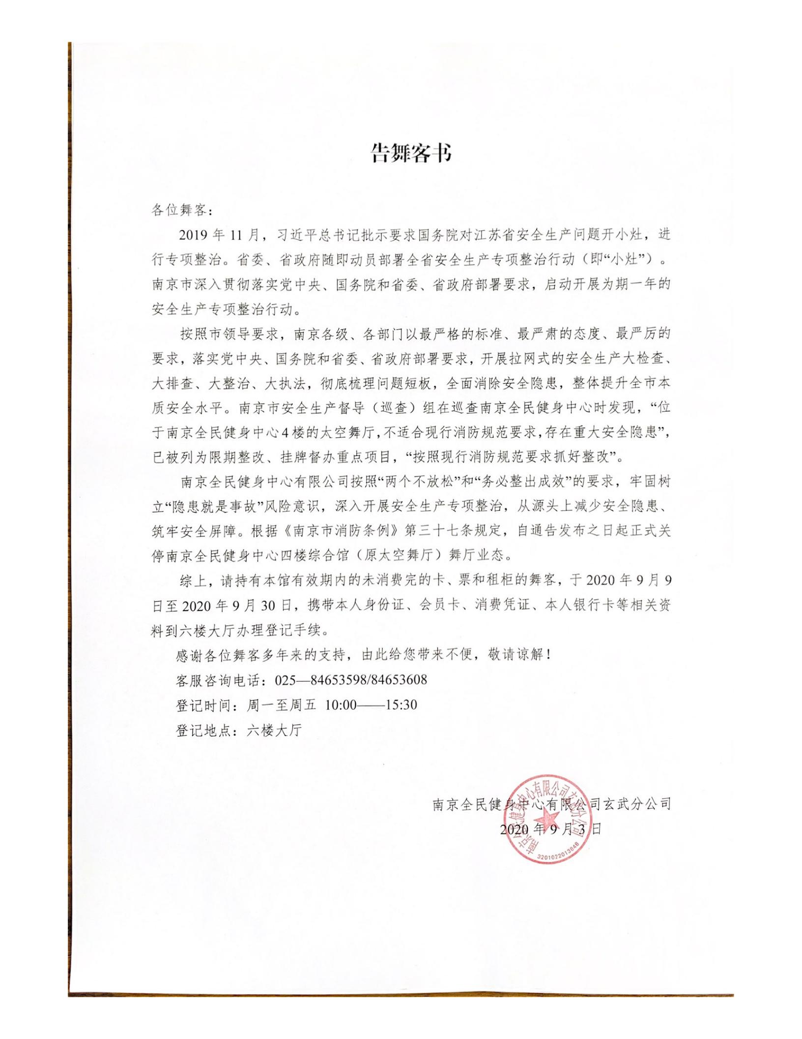 南京全民健身中心有限公司按照“两个不放松”和“务必整出成效”的要求,牢固树立“隐患就是事故”风险意识,深入开展安全生产专项整治,从源头上减少安全隐患、筑牢安全屏障。根据《南京市消防条例》第三十七条规定,自通告发布之日起正式关停南京全民健身中心四楼综合馆(原太空舞厅)舞厅业态。