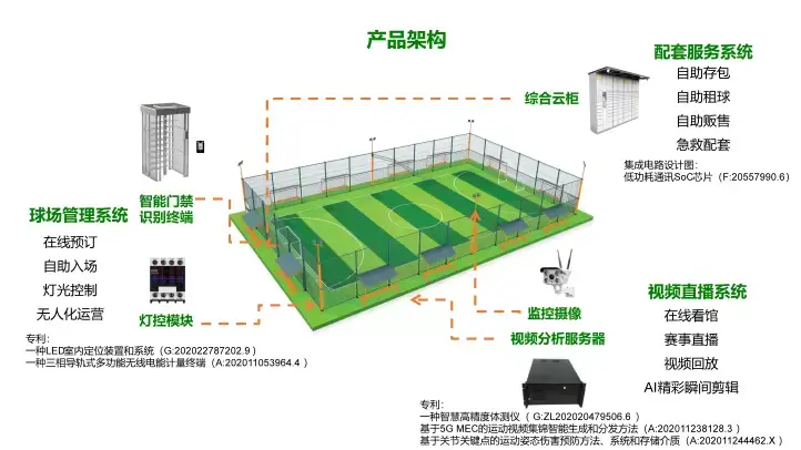 球场管理系统:通过对球场设备的物联网改造,通过5G网络实现设备的互联互通,为场地实现在线预订、自助入场、灯光控制和无人化运营功能。